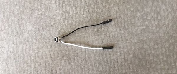 Take two (2) female-to-any wires from your stash, snip off the non-female end, then strip about an inch of casing to expose the wires. If you're using the same button as me, flip it over and you'll see two parallel plastic lines running the length of the button, inline with the metal connectors. Twist and solder your wires to the buttons metal connectors, one wire per plastic line. Here's how mine came out: